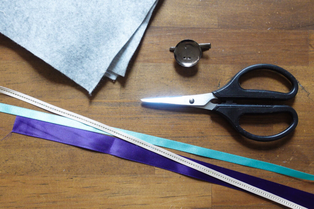 - 資材:フェルト、リボン(2種類)、パール飾り。