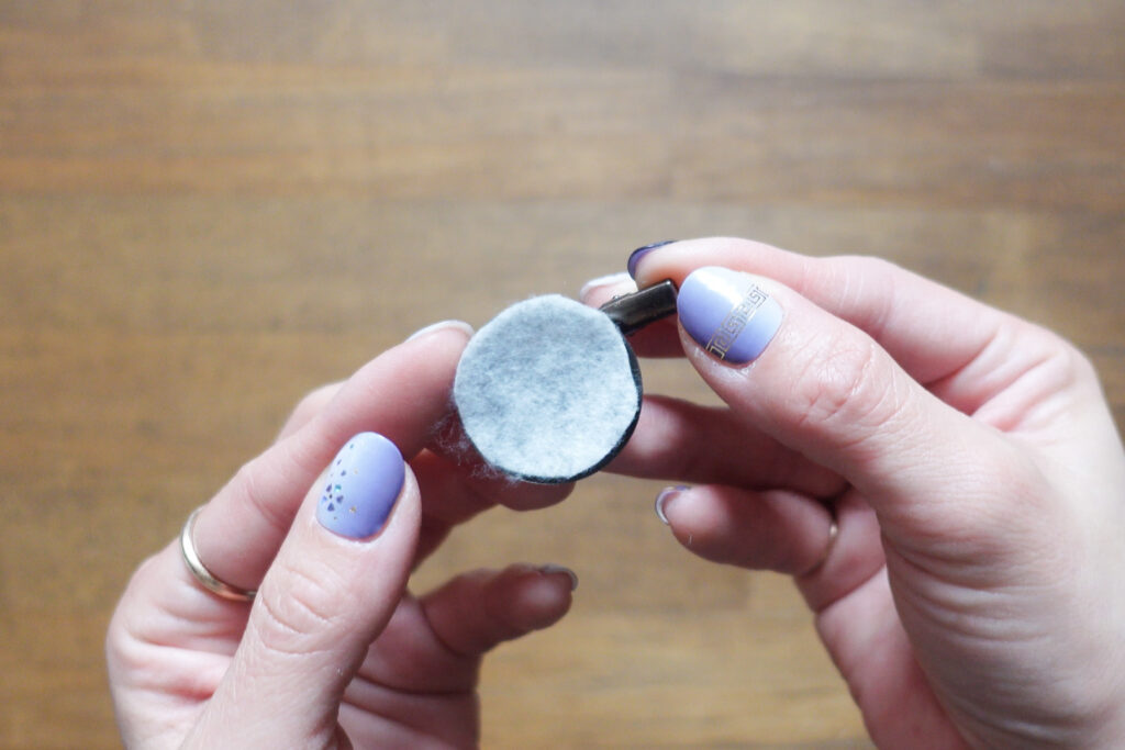 - 金具の接着:フェルトの裏側にたっぷりボンドを付け、金具と合体させます。