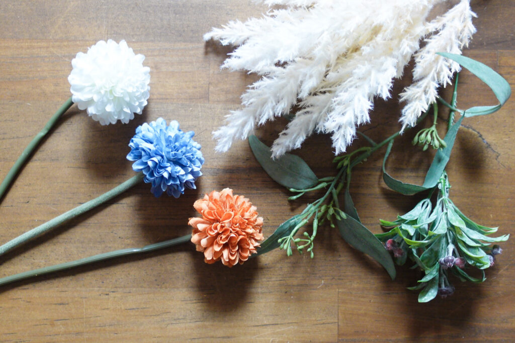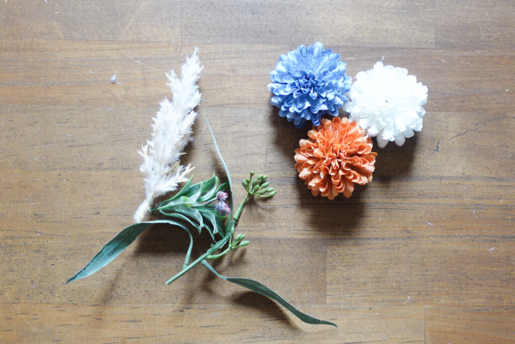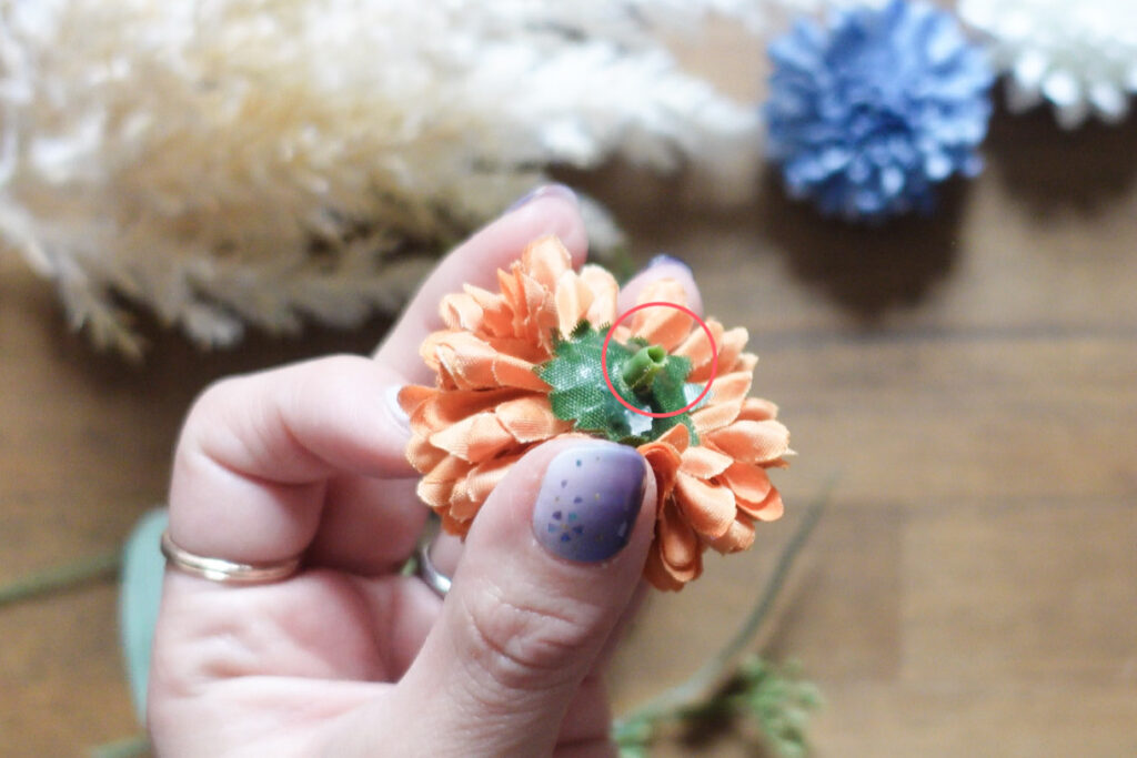 - マムの茎を外す:造花のピンポンマムは、引っ張るだけでステム(茎)が外れるものが多いです。少し残る根元の突起は、接着面になるので切らずに残しておきます。