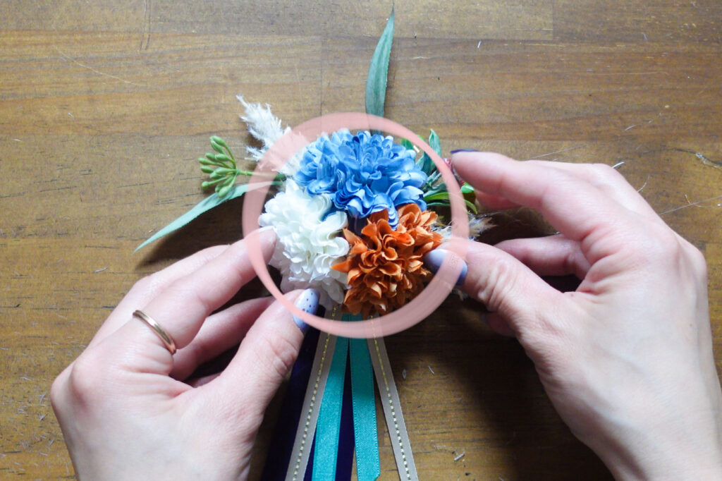 - 形を整える:3つのマムが1つの大きな花に見えるよう、キュッと寄せながら固定するのがポイント。隙間にベリーを差し込めば、密度が上がって一気にプロ級の仕上がりに!