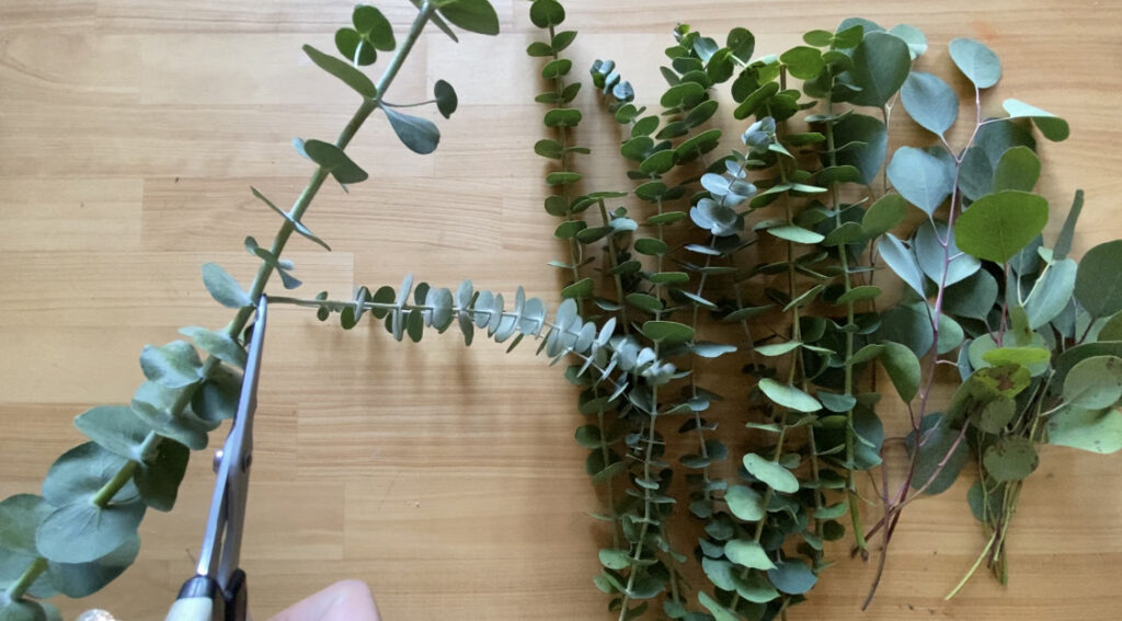 枝分かれしている根本をカットしていく。最初に全てカットしておくと後の作業がスムーズに進む。|ユーカリリース作り-mokuha