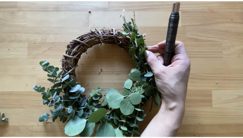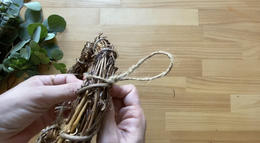 輪っかをひと結びし、リースに固定する。制作の目印にもなる部分。|ユーカリリース作り-mokuha