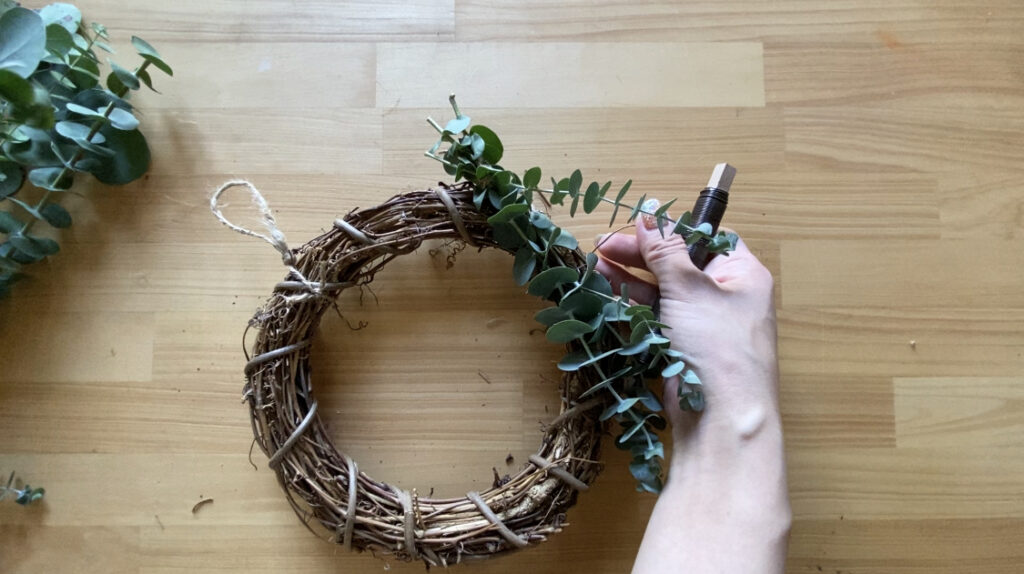 ユーカリの量や種類は全体のバランスを見ながら好きなように添えて巻いていく。|ユーカリリース作り-mokuha