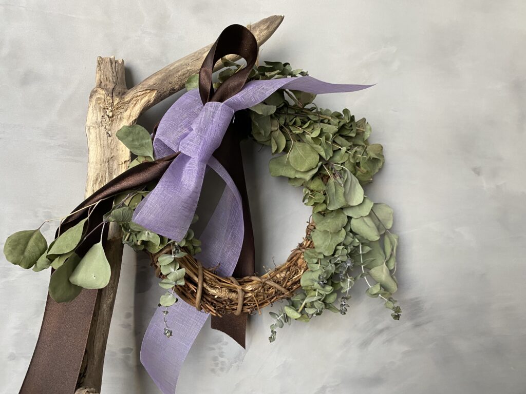 ユーカリの落ち着いたグリーンには、リネン(麻)やコットン素材の生成り色のリボンがよく似合いますが、私は少し個性的で大人の雰囲気が漂うパープルとブラウンの素材違いのリボンを大胆に飾ってみました。